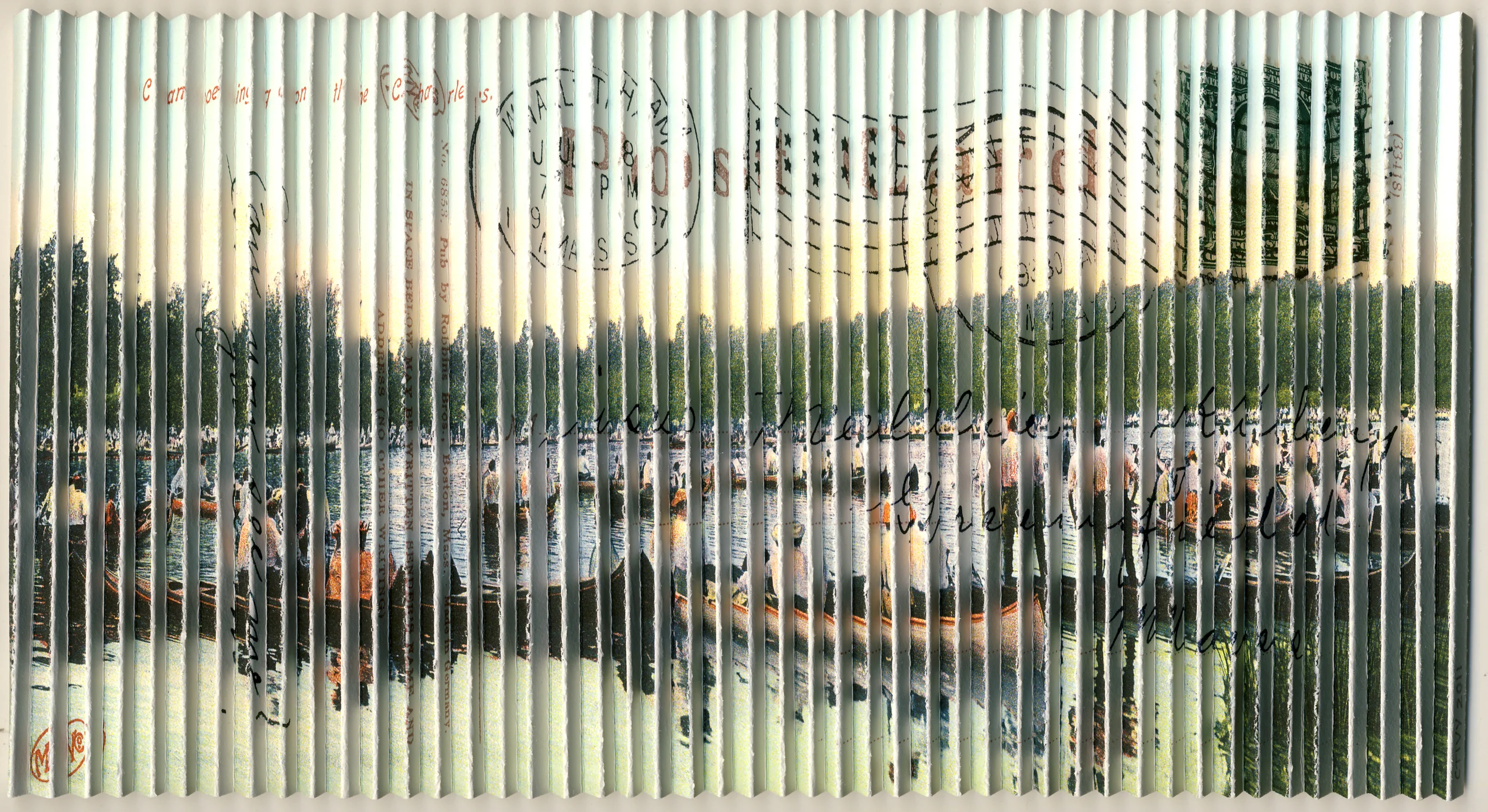 Hand-folded reproductions of twentieth-century postcards, presenting both sides of the card together in one image. When viewed from left or right, only one side of the postcard is visible. From the center view, both sides blend in a new dimension. More than 30 different prints are available.